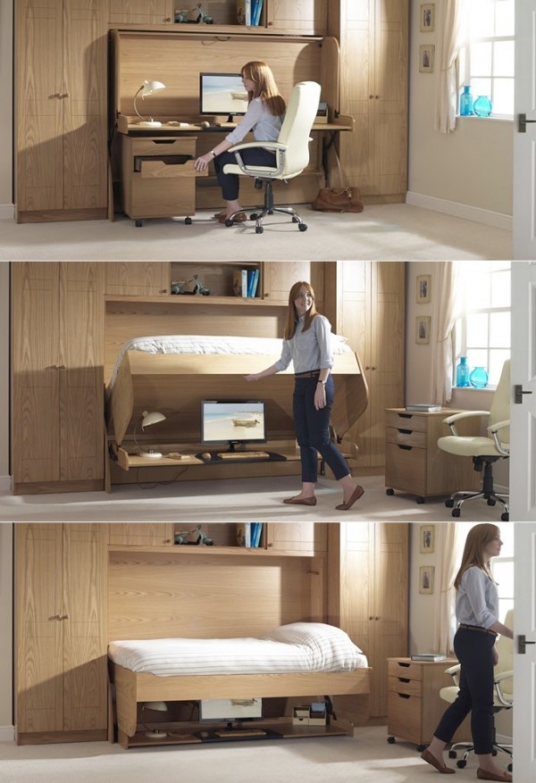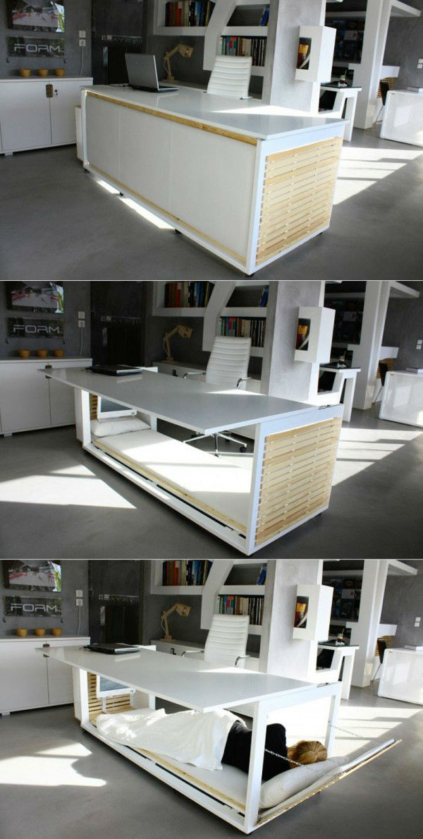 德国BLESS公司设计的一张很有趣的工作桌,平时是工作桌,但只要解除锁定开关后就可以翻转过来变成一张单人床,并且左右两侧设有置物空间可以来把桌上的东西清空,适合晚上加完班时可以让身体得到适度的休息的一张好桌(床)。